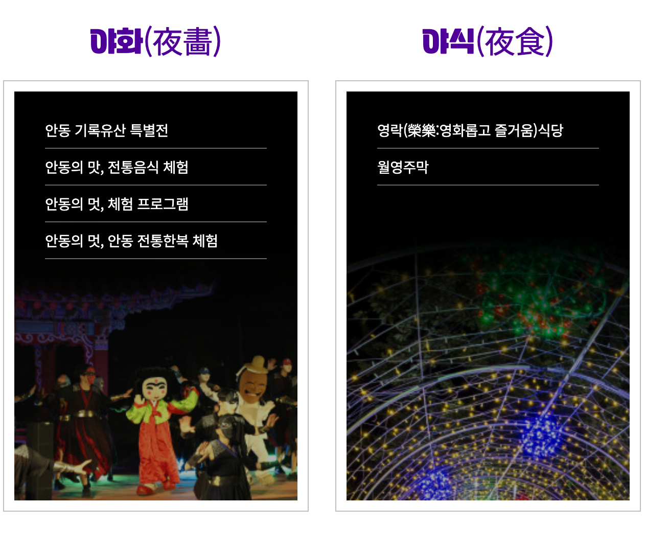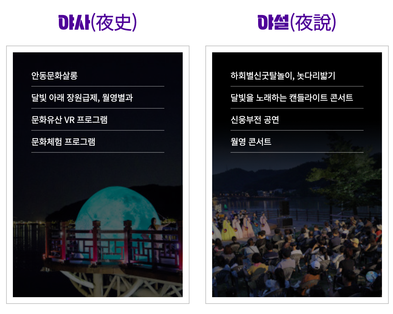 안동의 대표적인 여름밤 문화행사로, 다양한 전통 공연과 전시를 통해 안동의 문화유산을 체험할 수 있습니다.