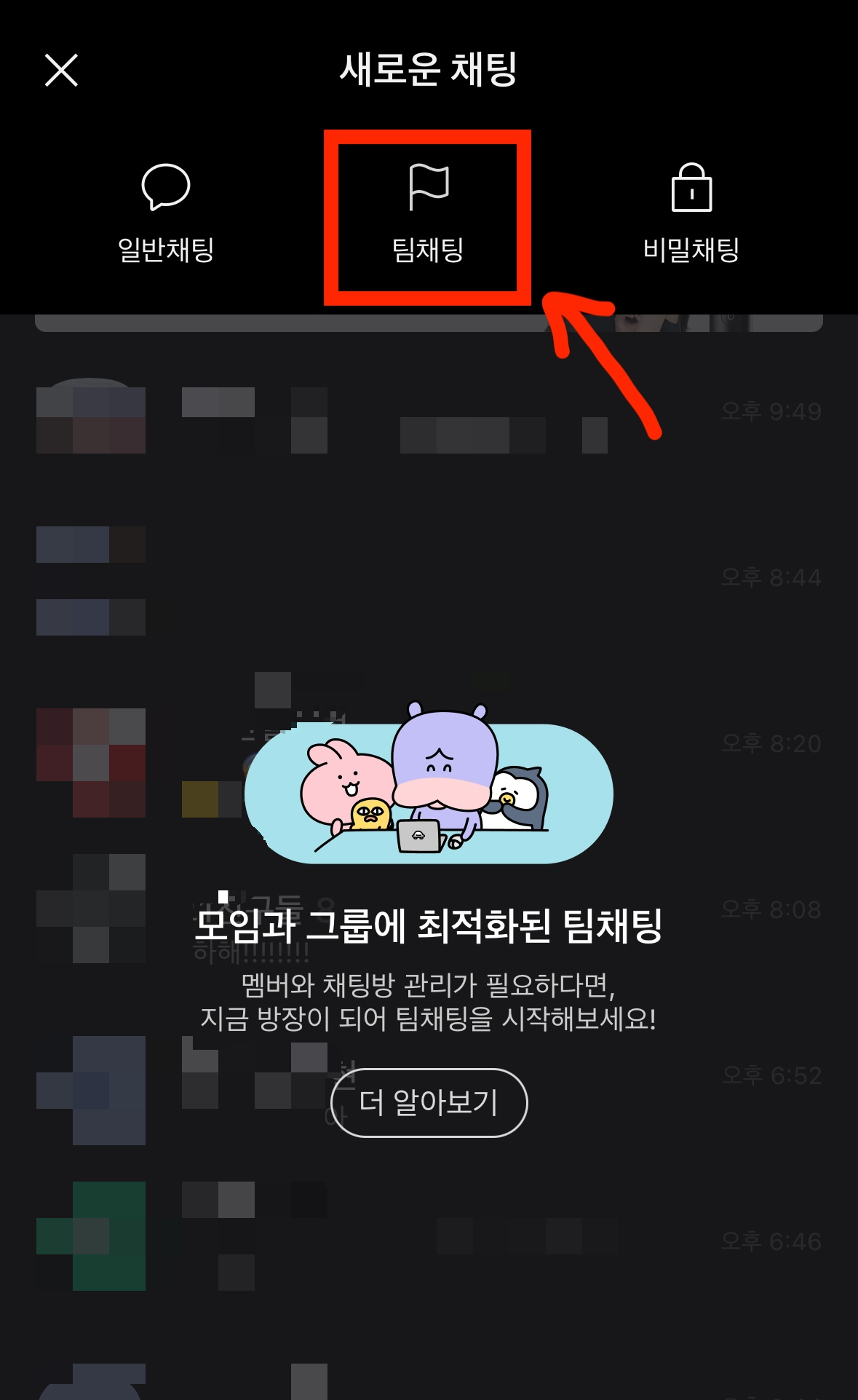 - 상단 가운데의 팀채팅 버튼 클릭